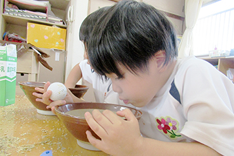 - 触れることから皮むき・ちぎる・切る など各年齢に応じて取り組み、幼児クラスではピーラーを使って野菜の皮むきをしたり包丁で切ったりしています。お手伝いの子は、お米を洗い炊飯器にセットします。他に、野菜の栽培や稲作、梅干作り、干柿など、四季を通じて取り組み、食文化を知る機会になっています。収穫した野菜は、クッキングし、食への関心を深めています。